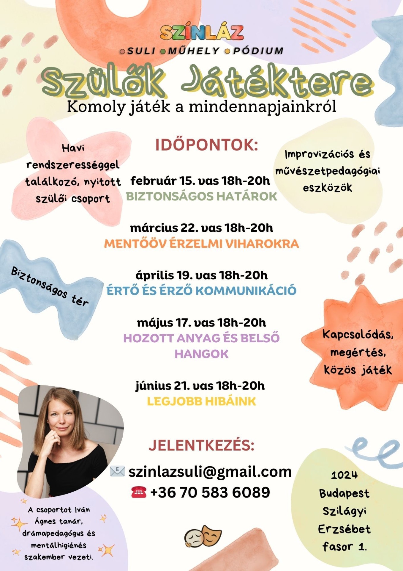 2026. februárban indul a Szülők Játéktere csoportom a Színláz Suliban, részleteket a Facebook oldalamon találsz, jelentkezni itt tudsz.